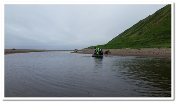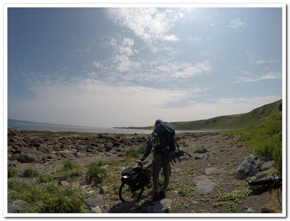 Поздним утром это все же случилось. Нагрузившись похудевшей поклажей, мы дошли до близкого мыска, вдоль которого нужно было идти все по тем же камням! Как это напоминало прошлые наши дни, но только они быстро иссякли и вновь открылось бескрайнее пространство песка. Микро бухточки и такие же мыски вились по побережью. Средняя скорость находилась у отметки 12 км. Все же ехать это весело, да и быстро. Впереди стал вырастать мыс Кузнецова, до которого от места ночевки было то км 16—18. Замелькали речушки Буча, Фастовка, Звонарка…