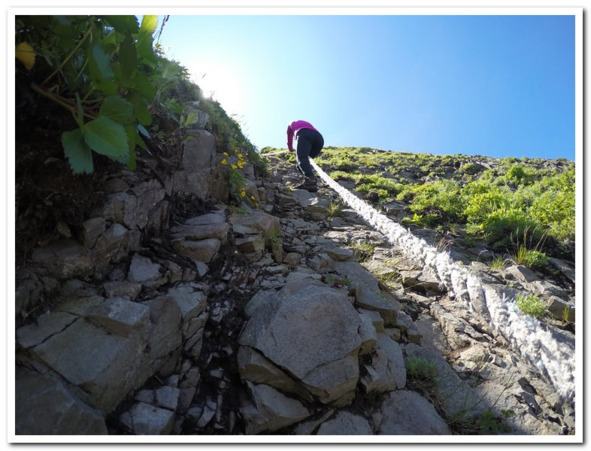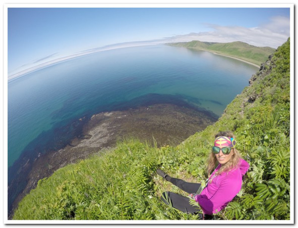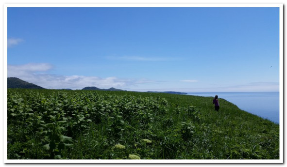 Древняя айнская крепость нависала над морем, она сама природой была сделана как неприступная крепость и если бы не крепкая веревка, мы бы тоже и в мыслях не думали, чтобы залезть на ее вершину. Подошли еще двое мужчин, они оказались немного проворней нас и поэтому пролезли на веревке вперед нас. Мы были в очереди последними и единственными, больше желающих не было, да и судя по слегка примятой траве на плоской вершине, таковых вообще было немного. Счастливщики, попадающие туда, должны быть несколько в неплохой физической форме, лезть приходится практически по 90-градусной стене с десяток метров. Восторженно мы встретили то что увидели.