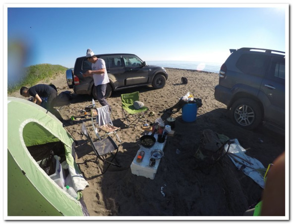 Море нашлось быстро, но оказалось, что оно не достаточно комфортное для омовения. Температурный режим был слишком жестким для брассов и кролей, хватило просто окунания, чтобы прийти в трезвое понимание. Пока стояли, отдыхали – мечтали о том, как оставшиеся 35 км до Шебунино преодолеем одним прыжком, не будем почти отдыхать, не присядем, а есть будем на ходу. Мечтательно мы отдавались трудовым грезам. Так, перебивая друг друга еще большими «трудовыми подвигами», мы прошли 500 метров, до реки Коврижка же. Как это иногда случается, нас спросили куда мы идем? А откуда? Ого, как далеко, а сколько? А может чая? Я не знаю что на нас напало в тот день, сплошные чаепития, экскурсии и малое продвижение вперед. Но раз судьба, вздохнули мы, то глупо с ней бороться, нужно лишь следовать ее указаниям. И мы остались на чай, который перерос в обед. Истинно мужская компания из Горнозаводска. Геннадий, правда с Невельска, но родом тоже с Горнозаводска. Они пытались ловить здесь симу, но ее уже было совсем мало, но уха была. Придумывать не буду, смысла нет, потому что она была вкусной. После нее произошла смена блюда, Геннадий попотчевал нас картошкой с белокопытником, попутно рассказав, как это делать. Нам, имеющим риск остаться без еды в тайге, показалось нелишним послушать неожиданную лекцию. Особый напряг приобрел разговор о медведях, как только углубились в различные истории о встрече с ними нос к носу, некоторые участники беседы стали уверять, что слышат, как в траве кто-то ходит! А вообще очень хорошо посидели, правда душевно. Здорово отдохнув и поблагодарив, отправились мы наверстануть хоть что-нибудь.