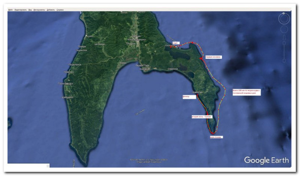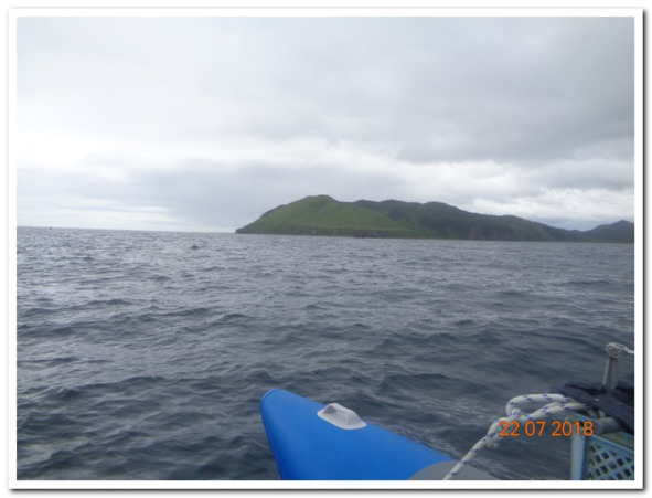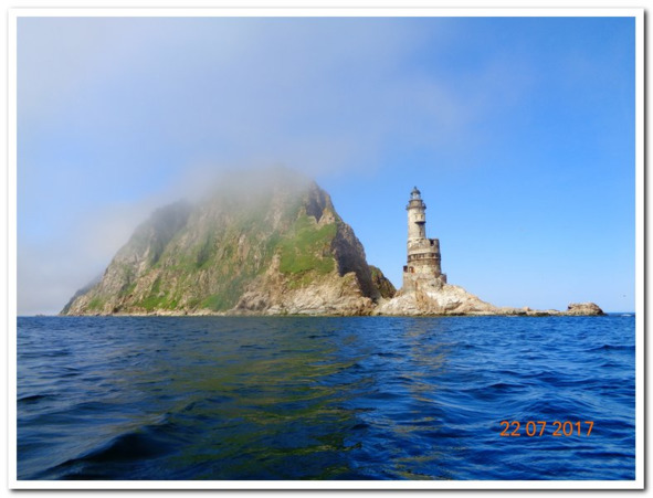 Вдалеке показалась гора Крузенштерна. Она доминирует по всему региону, не так давно на нее вернулись военные, и теперь там, как и в Советские времена, стоит радар дальнего обнаружения подлых натовских дерзких нарушителей границы. А еще, там сидят пограничники и бдят. Зазвонила рация и раздался голос – Кто мы и откуда, да куда путь держим, и какой номер нашего разрешения? Мы их быстро успокоили, что в Японию бежать не намерены даже если упадет туман. На этот раз нам поверили, и где то вдалеке черное жерло пушки перестало вести нас на мушке. Во всяком случае, я так почуял клетками поверхности кожи.