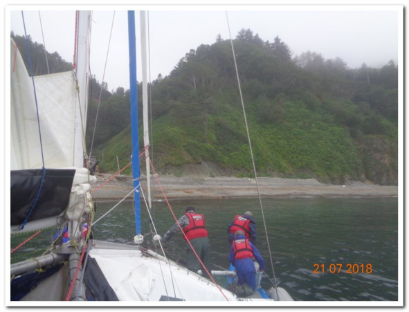 Бывает приходится пешком и по морю, и такое сваливалось на мою буйную голову, но редко. Гораздо чаще выходило так, что по морю я передвигался на корабле, лодке или даже на катамаране, как и в этот июль. Один из турклубов Сахалина заявил на всеуслышание, что готовит моряков для ходьбы под парусом. Мне никогда не приходилось бродить под парусом, и мы с моим приятелем Леней пошли посмотреть на это чудо дивное. Не сказать что я в итоге научился парусному делу, а вот у Лени дела пошли лучше, но речь не об этом, а о нашем зачетном походе на приличного размерами катамаране.