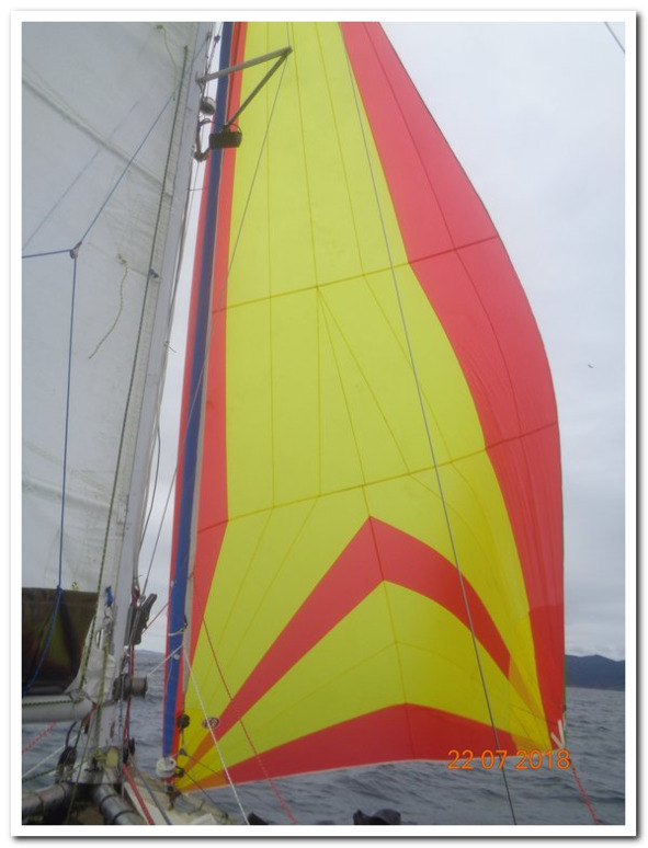 Не знаю сколько бы мы еще ели, а было что, если бы туман не раскидало по сторонам и не открылся берег. Все как то ободрились, стали шутить демонстрируя повысившуюся бодрость духа. Немного прошли на парусах, даже поставили какой-то почти красный косой парус, но ветер опять сдулся, и снова затеретрямкал двигатель, мы продолжили жечь бензин.