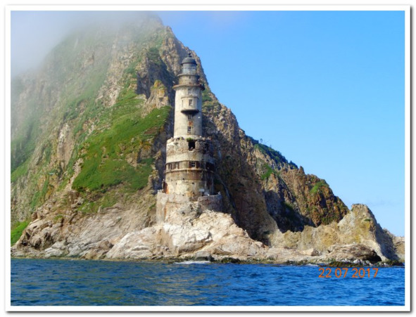 Все ближе и ближе, мелькнула лодка с туристами. Мы обошли мыс на западную сторону и просто выдохнули. Насколько стало теплей! Граница между Охотским морем и Анивским заливом была на расстоянии вытянутой руки, а разница в температурах чувствовалась без градусника. Да наконец-то наступило лето, радовалась та часть нашей команды, которая любила лето, а любила лето вся наша часть. Ладно, давайте к делу. Высадились на маяк, не все, но я в рядах десантников затесался без вариантов, хоть и был здесь в прошлом году.