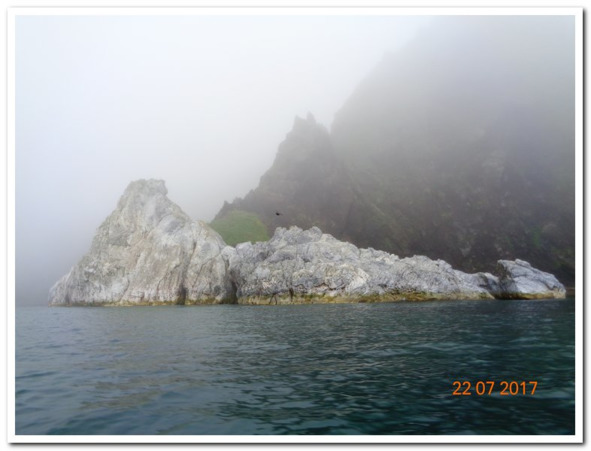 Белая как покрывало, но название получило из-за своего габитуса. С моря похожа на миноносец – боевой корабль, по японски гункан. Название сохранилось за мысом и речушкой. До него не близко, поэтому торопливо скользим по камням к судну. Нас подхватила родная палуба и мы забалдели на юте и носу. Стало тепло как летом в июле, если отрешась забыть что сейчас лето и июль, Охотское море закончилось, а с ним и холодная зябь мокрого тела. Кое-кто стал раздеваться, появились обнаженные участки тела, пока еще не смелые и немногочисленные, но начало положено!