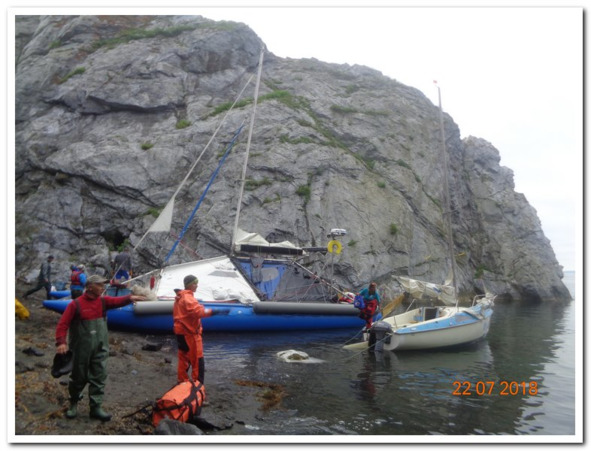 Мало-помалу прошли первый маяк, но он столь мало известен, что никто даже не обратил на него внимания и мы споро обогнули мыс Свободный. Шли себе вдоль берега глядя на который я вспоминал поход в 2012 году, мы тогда шли по берегу пешком, и это было как-то занимательней. И все, больше про первый день плавания особо сказать то и нечего. Поэтому перейдем сразу к первой швартовке. Как вы догадываетесь, время подходило к вечеру, когда именно в это время суток начинает темнеть, а ночевать в открытом море нам не хотелось. И мы смело углубились в туман. Да, спустился туман, да такой густой, хоть ешь. Выяснилось, что навигационная карта, что идет в комплекте с приборным оборудованием, какая-то слишком условная, и рассчитать точное приземление в берег получится с трудом. И ладно бы если берег был как берег, так нет, все побережье было усеяно каким-то камнями, скалами, кекурами. Красота для кого-то, и геморрой для нашей швартовки. Ни черта не видно куда тыкаться.