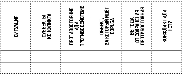Вспомните несколько похожих на конфликт коммуникаций из собственной жизни. Препарируйте их с помощью таблицы ниже. Ответьте себе на вопрос: был ли в каждой из этих ситуаций настоящий конфликт? И, вспомнив, как вы выходили ли из этой ситуации, задайтесь вопросом: выходили так, как стоило бы? Выходили ли вы как из конфликтной или договорной? Это маленькое упражнение полезно делать в своей жизни время от времени.