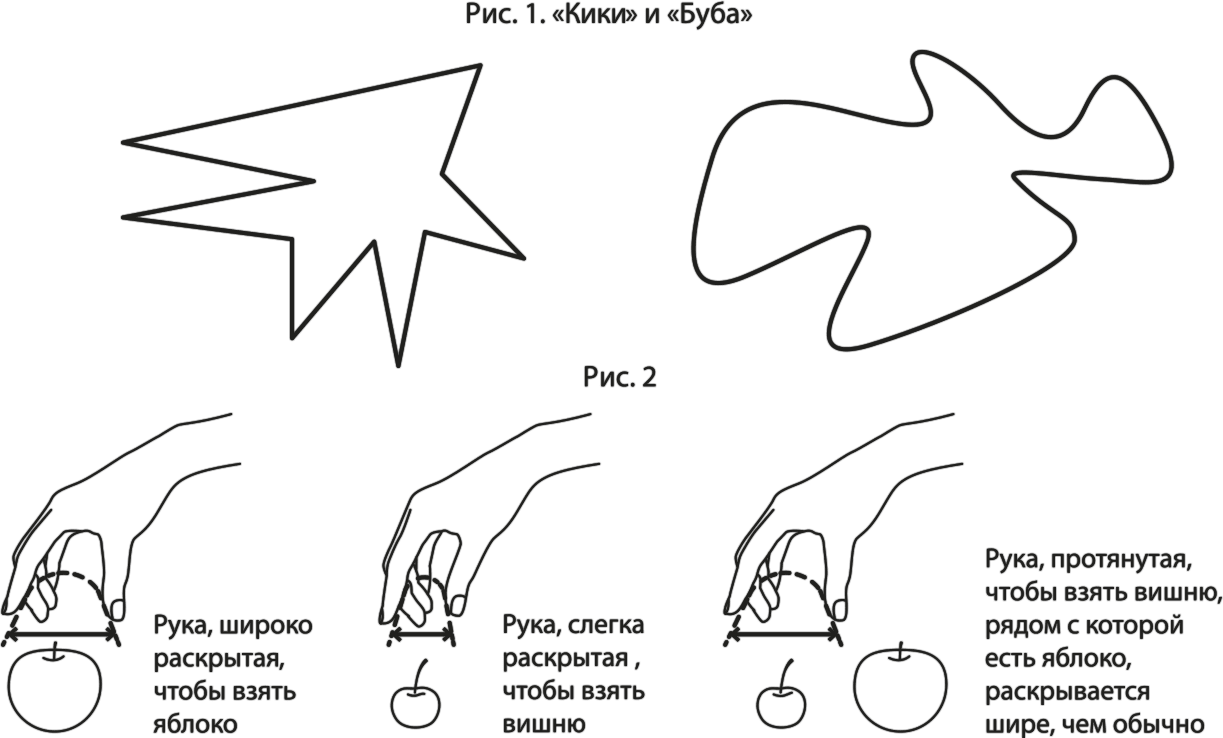 Когда во сне я отлеживаю себе руку и меняю положение тела, даже не проснувшись, я в этот момент думаю этим самым «протомышлением». Когда мой мозг отождествляет одну фигуру Вилейанура Рамачандрана с «бубой», а другую – с «кикой» (рис. 1), это тоже мыслительный процесс, который, впрочем, я даже не могу толком осознать. Это «протомышление». Наконец, когда моя рука сама определяет, как растопырить пальцы, направляя руку в тарелку с фруктами (рис. 2), – она делает это не сама по себе, но и не бессмысленно, хотя, конечно, мое личностное «я» тоже не вычисляет этот угол. Все это примеры «протомышления».