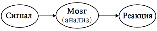 Общая схемаБесчисленное количество сигналов постоянно попадает на рецепторы нашей нервной системы, здесь они перекодируются, превращаясь в нервные импульсы. Далее, уже в таком, измененном, виде, эта информация поступает в мозг. Тут, в этом аккумуляторе, в этом «банке данных», она смешивается с уже имеющейся информацией, хранящейся, перерабатываемой, вновь создаваемой из прежних элементов. В результате этого смешения получается некий «продукт», который и представляется на суд нашего мозга; мозг судит и принимает решение. Это решение и воплощается в виде реакции на ту изначальную стимуляцию, которая «упала» на наш рецептор. Этим решением может быть какая-то мысль или переживание, чувство, движение – что угодно!