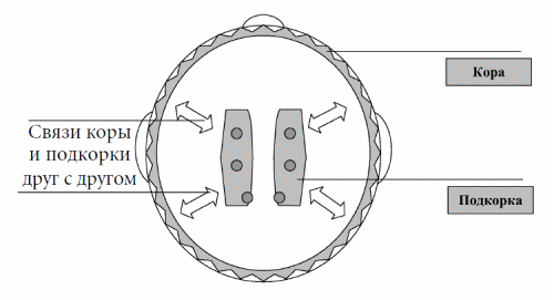 Подкорка, кстати сказать, тоже «серое вещество», и, по большому счету, именно оно и думает, хотя это не те мысли, которые мы произносим или можем произнести в словах, это скорее те мысли, которые есть наши следования динамическим стереотипам, и те, которые суть доминанты нашего поведения. Сознание (производное коры) только сопровождает, прилаживается к тем подлинным нашим мыслям, которые нам самим доподлинно не известны, которые живут в нас на правах смутных ощущений, кажущихся, едва уловимых внутренних движений (рис. 4).