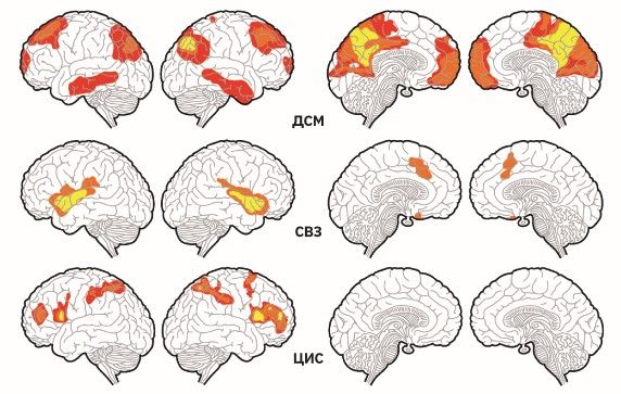 Рис. 2. Области, задействованные при активизации дефолт-системы мозга (ДСМ, верхний ряд), сети выявления значимости (СВЗ, средний ряд), центральной исполнительной сети (ЦИС, нижний ряд)