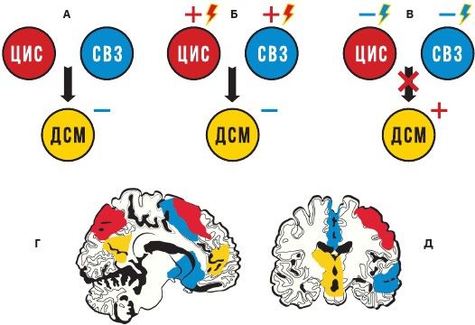 Рис. 3. В столбце А представлена теоретическая модель отношений между центральной исполнительной сетью (ЦИС), сетью выявления значимости (СВЗ) и дефолт-системой мозга (ДСМ). В столбце Б представлены результаты инструментальной активизации областей, входящих в ЦИС и СВЗ. В столбце В – результат подавления (ингибирования) активности в ЦИС и СВЗ. В нижнем ряду – Г и Д – представлены области мозга, активность которых изменялась и замерялась во время исследования[11]11