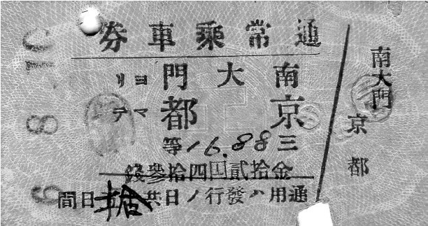 Билеты от станции Намдэмун, то есть Кёнсона (Сеула), до станции Киото. Маршрутом предусматривается пересадка с поезда на паром, а потом – с парома на поезд. Билеты представляли собой вариацию так называемых билетов Эдмондсона, которые были впервые введены в Британии в 1840-е гг. и более столетия оставались стандартом почти по всём мире, включая и Россию (СССР) (прямоугольник из картона размером 30 на 57 мм)