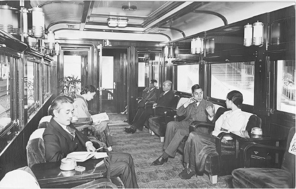 Салон-вагон первого класса в знаменитом экспрессе «Акацука». Среди пассажиров представлена и женщина, одетая по-японски, и женщина, одетая по-корейски (о национальной принадлежности мужчин элиты судить в подобных местах было сложно, так как все носили костюмы западного образца). Фотография из рекламного проспекта 1930-х гг.