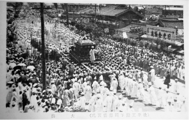 Похороны Кочжона, последнего корейского короля, который реально правил страной. Под японским давлением он отрёкся от престола в 1907 году. Смерть Кочжона в 1919 году привела к подъёму патриотических и антиколониальных настроений, результатом чего стали массовые выступления против японского правления – «Первомартовское движение» 1919 года