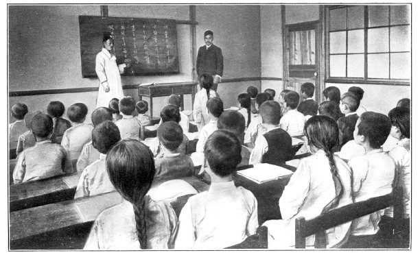 Корейская школа современного типа в 1910 году. В таких школах преподавали геометрию и химию, а не историю Древнего Китая, и весь их уклад был скопирован со школ западных стран: ученики носили форму, сидели за партами лицом к учителю, в классе были доска и учебные пособия привычного нам типа