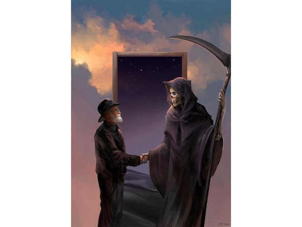 Конец был ближе, чем мог полагать сам писатель и его окружающие. 12 марта 2015 года стал последним днем, когда Терри Пратчетта шагнул в мир другой. По его же истории, идет описание, где за ним приходит смерть. Дверь открыта, за ней что-то туманное и далекое. Облака клубятся, провожая писателя в дальний путь. Рукопожатие с вестницей смерти, и вот он уже в новом мире. Глубокое далекое звездное небо уносит его вдаль куда-то вверх. Писатель кружится в воздухе, теперь он подобен птице парящей и совершающей далекий переход на теплый юг. Там хорошо. Сказочный мир проступает яркими почти акварельными красками, там внизу плоский мир, который лишь начало и проход к еще более удивительным мирам, о которых он не успел описать. Наверняка он описал бы всю фантасмагорию далекого, рассказал бы о чудесах, что скрываются за пеленой материального мира. Эту пелену сбросить могут лишь фантасты с неистощимой фантазией, способные переплетать реальность с вымыслом.