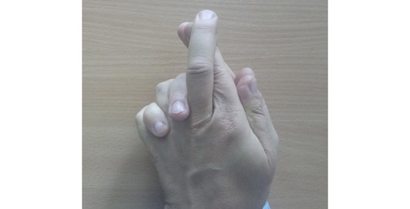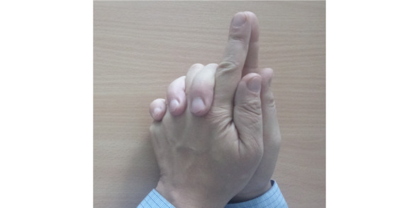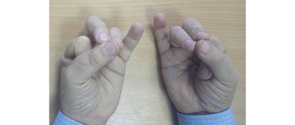 Способ выполнения РАДЫ: большие пальцы обеих рук соединены, указательные пальцы выпрямлены и соединены концевыми фалангами. Средние пальцы соединены между собой. Безымянные пальцы и мизинцы обеих рук перекрещены друг с другом и лежат у основания средних пальцев. Не играет роли, мизинец какой руки будет снизу при переплетении.