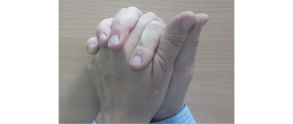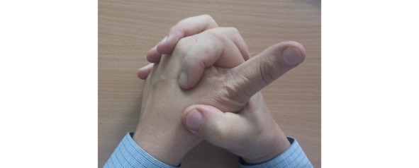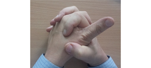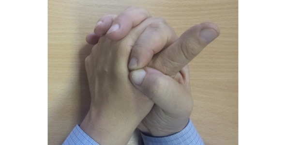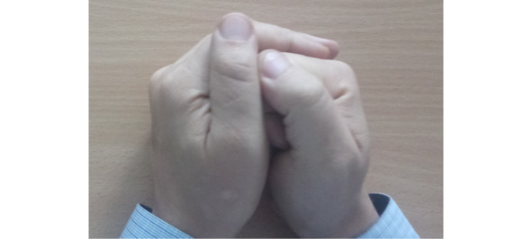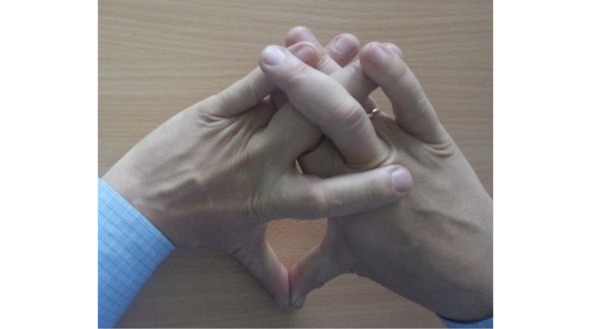 Способ выполнения РАДЫ: средний палец правой руки обхватывает и прижимает концевую фалангу указательного пальца той же руки. Аналогичную комбинацию выполняют с пальцами левой руки. Соединяем обе руки. Большие пальцы обеих рук соединяются между собой боковыми поверхностями. Остальные пальцы скрещены между собой. Не играет роли, безымянный палец какой руки будет сверху при переплетении.