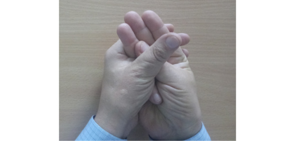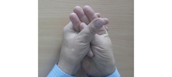 Способ выполнения РАДЫ: мизинец правой руки отгибаем таким образом, чтобы он прикасался к основанию большого пальца, которым слегка прижимаем мизинец. Левой рукой обхватываем правую руку снизу, при этом большой палец левой руки располагается на большом пальце правой руки. Если вам неудобно, может поменять местами руки и соединить их в зеркальном отображении.