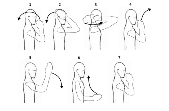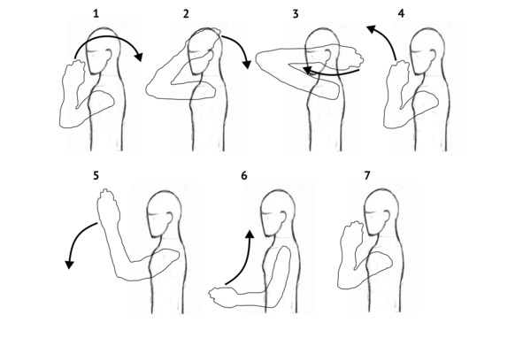 Из центра обращения делаем через правое плечо маленький кружочек назад, начиная сверху, затем через центр обращения делаем большой круг вперёд и вверх, далее по дуге вниз и в исходное положение.