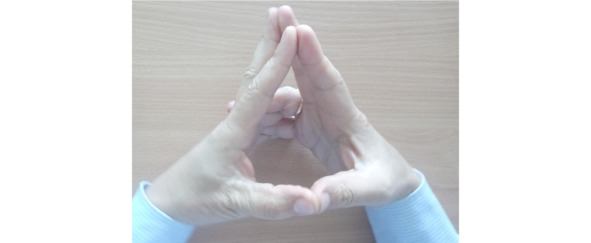 Способ выполнения РАДЫ: подушечки безымянного, мизинца и большого пальцев соединены вместе, а оставшиеся слегка согнуты и расслаблены. РАДА выполняется обеими руками.