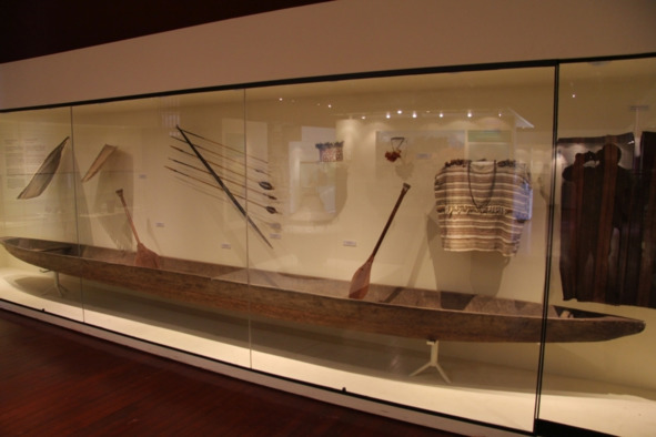 На всех предметах видны прикрепленные к ним бирки, свидетельствующие, что экспонаты атрибутированы в рамках общей коллекции. Однако в витринах не у каждого предмета есть относящийся к нему указатель. Возможно, это связано с тем, что витрины имеют тематическое назначение: оружие, предметы быта, одежда, украшения из перьев, маски.