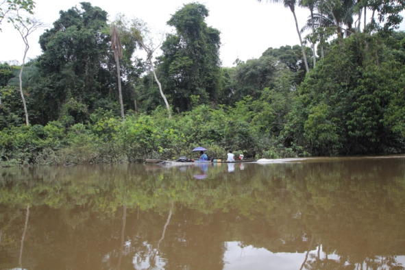 Около двух часов дня мы делаем остановку в общине мацес Хорхе Чавес чтобы перекусить. В деревне почти нет людей. Единственный встреченный нами мужчина говорит, что все ушли куда-то по своим делам, возможно, на чагру. Экономя время, едим на берегу, сидя в лодках. Затем вновь отправляемся вверх по реке.