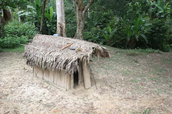 Рядом с малокой стоят еще три строения прямоугольной формы на высоких деревянных сваях, возведенных полностью из природных материалов, имеющих двускатные крыши из пальмовых листьев: два открытых навеса и одна хижина.