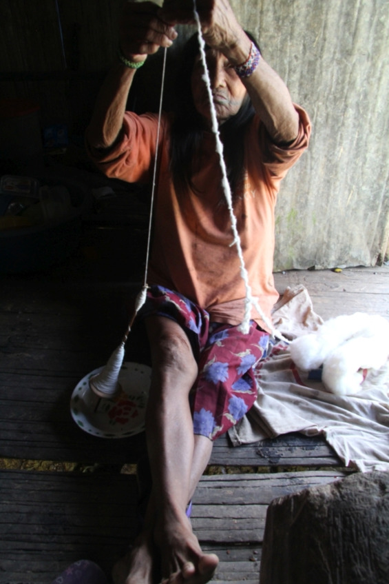 Кане находится в Буэн-Перу, но завтра она планирует отправиться вместе с нами в малоку на Лобояку. Пожилая женщина говорит, что ей больше нравится жить в малоке. В сравнении с прошлым годом Кане выглядит совсем неплохо. Она узнает меня и предлагает нам, возвращающимся с чагры мимо ее дома, зайти внутрь. Угощает бананами и папайей. Она сидит в гамаке и скручивает на маленьком деревянном веретене с глиняным колечком-стопором из белого пушистого комочка хлопка нить. Из этой нити она плетет традиционные нарукавники мацес. Я впервые вижу, что их делают из белоснежного хлопка и никак не окрашивают. Нарукавников у нее несколько пар, возможно, их окраской она займется позже или даже кто-то другой, не знаю.