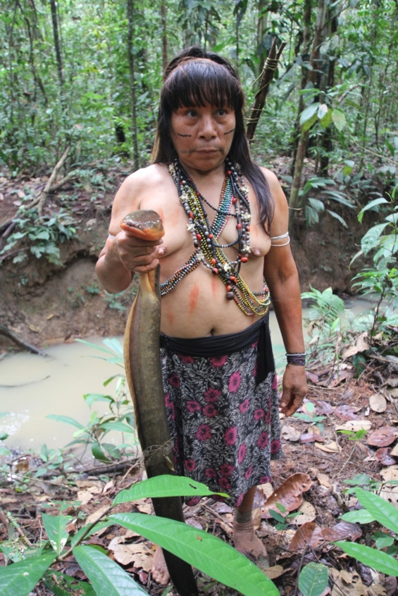 Я отлучился на некоторое время в лес и не видел, как мацес поймали упитанного электрического угря (Electrophorus electricus) длиной около метра, также задохнувшегося от воздействия барбаско. Мацес отрубили ему голову мачете, обезопасив себя от возможных мощных электрических разрядов, которые способна генерировать эта рыба.