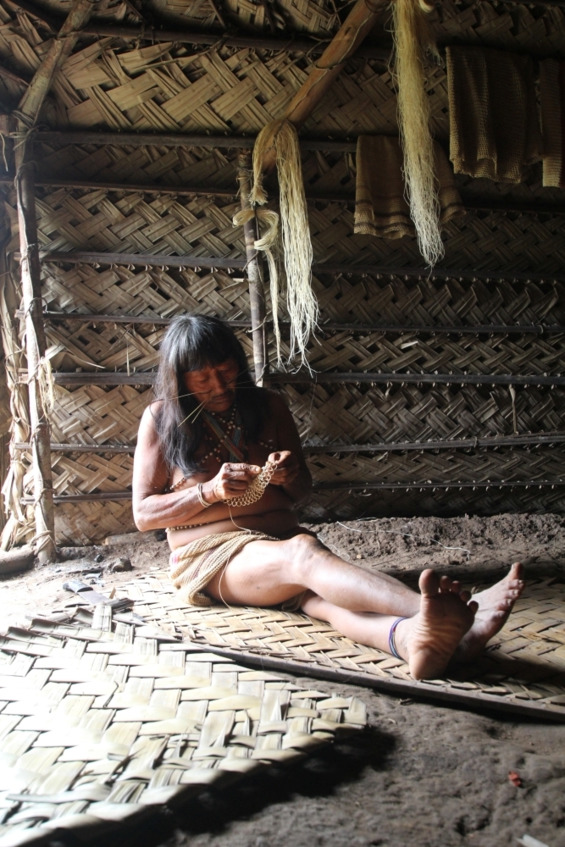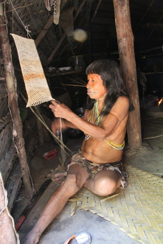 Утром часть жителей коммунального общинного жилища ушла в лес, другая осталась в малоке. Находящиеся в малоке женщины плетут из волокон пальмы чамбира корзины и сумочки.