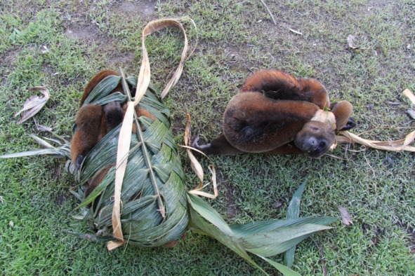 Обезьяну сначала ощипал за пределами малоки Туми (Самуэль). Затем тушку обезьяны положили на угли костра, чтобы полностью опалить шерсть, после чего ее унесли разделывать на берег реки. Сахино женщины освежевали у заднего входа коммунального общинного жилища.