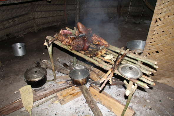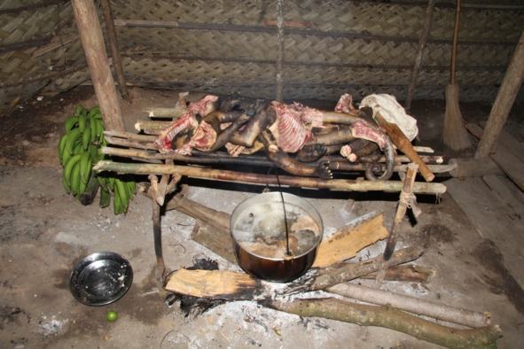 Ночью Туми (Хулио) убил мачете каймана. Как обычно, часть мяса рептилии сварили, а другую закоптили.