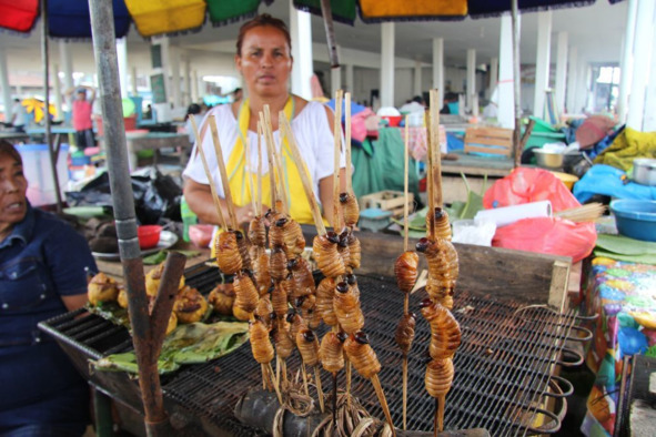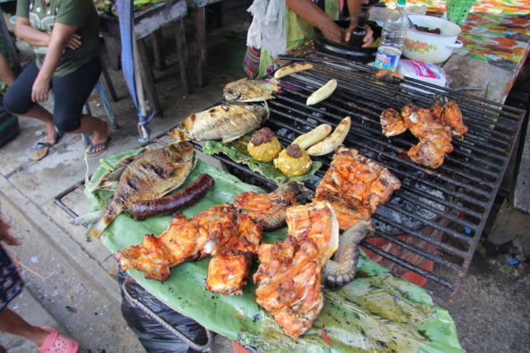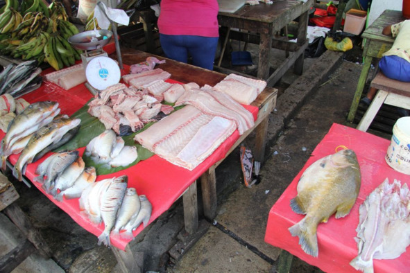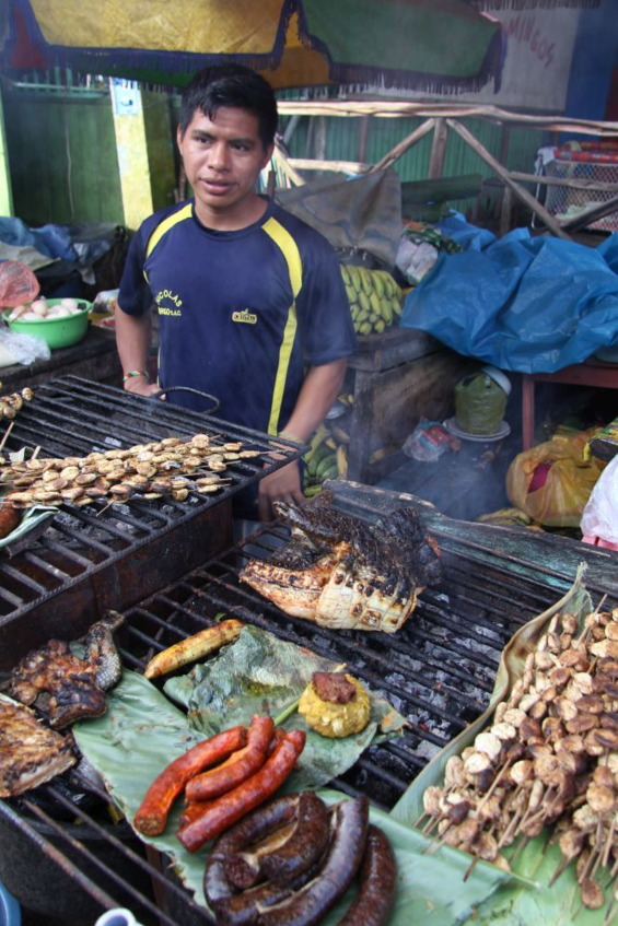 Вечером к закату солнца, взяв мототакси – тук-тук, поехали с Алексеем Корзиным на север Икитоса в район Нанай, расположенный на берегу Амазонки. Нанай – колоритное место, здесь находится одноименный рынок и пристань. К причалу постоянно подходят пестрые лодки различных типов и размеров, громко играет задорная латиноамериканская музыка, открывается панорамный вид на величественную Амазонку. На рынке до темноты продают всевозможные фрукты, мясо домашних и диких животных, рыбу, бразильские орехи, лекарственные растения и другие дары леса. Тут же коптят мясо кайманов, рыбу и жирных пальмовых личинок.
