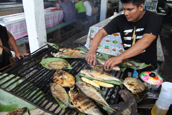 Продавцы предлагают мясо каймана, приготовленное на углях