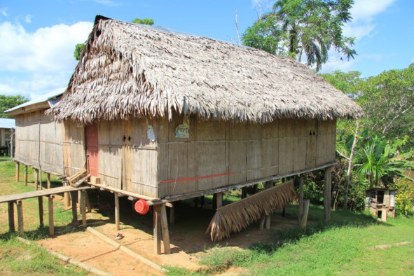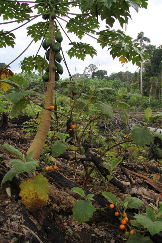 Вокруг малоки растут несколько персиковых пальм (Bactris gasipaes), которые в перуанской Амазонии называют пейхуао. На пальмах много небольших зеленых плодов, очевидно, они созреют, став ярко-красными, в ближайшее время.