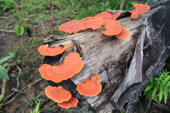 Лежащие на чагре стволы деревьев покрывают яркие грибы