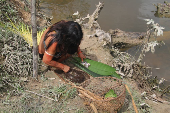 Туми (Сегундо) размочалил корни барбаско при помощи деревянной колотушки, после чего промыл их несколько раз в ручье, отчего его вода стала мутно-белой. Параллельно женщины взбивали ногами взвесь со дна ручья.