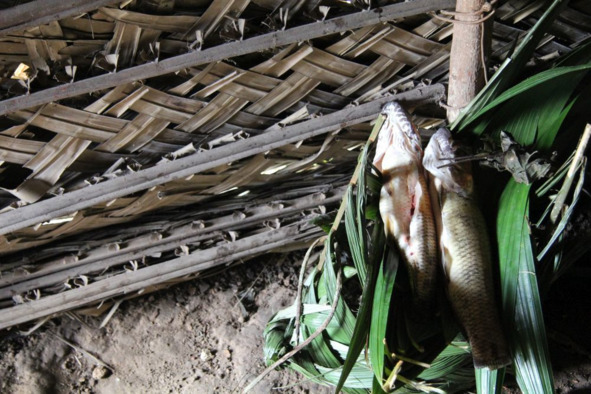 Весь собранный сачками улов уже в лесу разделили поровну между всеми участниками рыбалки. Рыбок завернули в несколько зеленых продолговатых листьев, плотно перевязав их лианами.