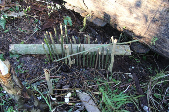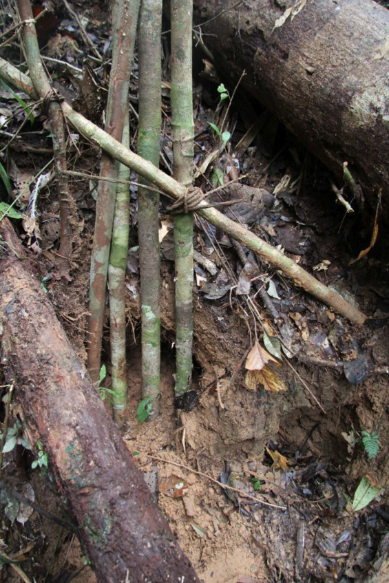 Уже на следующее утро тяжелое бревно ловушки сдавливающего типа лежало на земле, но ни приманки, ни зверька, ее укравшего, не было. Возможно, грызуну удалось стащить приманку, кусочек маниока, как-то с боку, минуя смертельный коридор, над которым нависало увесистое полено.
