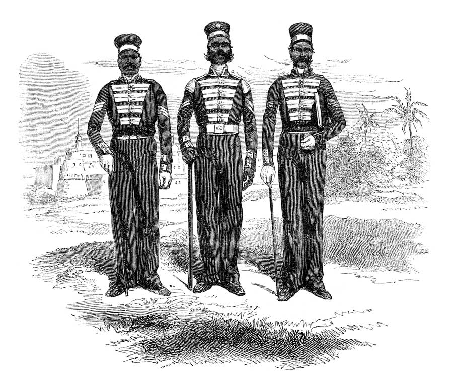 Важную роль в захвате Индии играли войска Ост-Индской компании. Сначала англичане воевали традиционно – экспедиционным колониальным корпусом. Но вскоре они стали нанимать на службу и обучать местных жителей, так, уже в 1757 году, когда англичане громили Сираджа-уд-Даула, в английском отряде было 2000 местных наемников. Но по-настоящему формирование войска Компании началось в 1772 году генерал-губернатором Уорреном Хейстингсом. Он как раз сделал основой армии индийских наемников, сипаев. Слово «сипай» происходит от персидского «сипахи» – солдат. Структура войск Компании была такова: старшие офицерские должности обычно занимали англичане, младший состав и рядовой – туземцы. При этом в Индии под контролем Компании оставались и собственно британские подразделения. Так, на 1796 год войска Компании насчитывали 70 тысяч, из них как таковых британцев 13 тысяч, а еще 57 тысяч сипаев. Для туземных подразделений была сформирована отдельная иерархия унтер-офицерских чинов. Сипай соответствовал рядовому британской армии, выше шли ланс-наик, наик и хавильдар в пехоте или ланс-дафадар-стажер, ланс-дафадар и дафадар в кавалерии – то же самое, что сержант, капрал и ефрейтор. Кстати, эти же названия до сих пор используются в индийских и пакистанских наземных войсках.