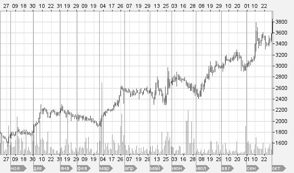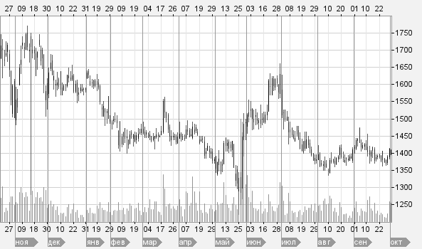 Рис. 1. График изменения цены акции ОАО «Магнит» с октября 2009 по октябрь 2010 года