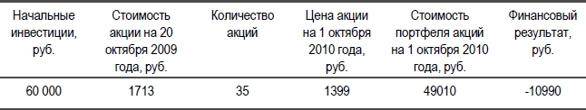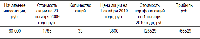 Итак, на конец дня 20 октября 2009 года цена одной акции ОАО «Магнит» составляла 1785 рублей. Изменение стоимости инвестиционного портфеля, состоящего из одной ценной бумаги, можно оценить по Табл. 1. Так, на 1 октября 2010 года цена акции составляла 3800 рублей. Итого прибыль от данного вложения денег (или инвестиции) составляет 66 529 рубль, или 110, 88 % годовых. Таким образом, инвестор может рассчитывать на доход существенно более высокий, нежели процент по банковским депозитам, который составляет в среднем от 6 % до 12 % годовых. Поэтому если он руководствуется соображениями получения более высокого дохода, чем простая компенсация влияния инфляции на его сбережения, которую в большей или меньшей степени даёт банковский депозит, то его выбор будет за инвестициями в ценные бумаги. В данном примере рассматривается поведение пассивного инвестора, размещающего средства на срок один год на рынке ценных бумаг (т. е. покупающего бумаги в начале года и продающего по прошествии одного календарного года).