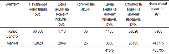 Итоговый результат от данных инвестиций составляет 35795 рублей, или около 60 процентов, за тот же самый год. Как видим, управление портфелем пусть и не принесло фантастических результатов (как в Примере 1), но все же позволило нашему гипотетическому инвестору выйти из потерь от неудачного вложения денег в акции ОАО «Полюс Золото» и все же получить вполне пр иличную прибыль. Кроме того, возможно, покупка акций ОАО «Магнит» имеет более долгий горизонт с точки зрения нашего инвестора и, вероятно, он будет продолжать держать акции и в течение следующего года. То есть продажи акций ОАО «Магнит» не произойдет, они по-прежнему будут оставаться в портфеле инвестора, а их курсовая стоимость будет составлять текущую незафиксированную прибыль (или убыток), которая из виртуальной превратится в реальную лишь в момент продажи акций.