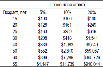 Возьмем, к примеру, 35-летнего Петра. Если Петр однажды инвестирует $100 и забудет о них, они начнут «расти», т. е. прирастать процентами. Насколько быстро? Давайте возьмем несколько разных процентных ставок. 5 % за год он может получить в западном банке, 10 % в год он может получить в российском банке, 20 % в год он сможет получить на фондовом рынке, если его инвестиции будут вести себя немного лучше, чем рынок в среднем. (Этого можно добиться, например, с используя услуги консультантов, читая соответствующие книги, или посещая обучающие семинары).