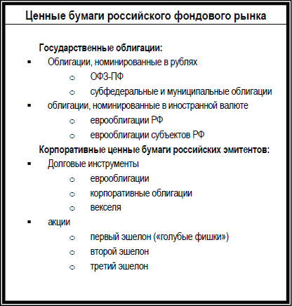 Кроме того, ценная бумага обладает рядом свойств, которые сближают ее с деньгами. Ее главное свойство – это возможность обмена на на деньги в различных формах (путем погашения, купли-продажи, переуступки и т. д.). Она может быть предметом залога, храниться в течение ряда лет или бессрочно, передаваться по наследству, служить подарком и т. д. Присутствующие на российском рынке ценные бумаги показаны в таблице.