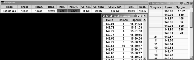 Ясно, что котировка отражает наилучшие цены спроса и предложения в данный момент на рынке. На примере из Рис. 5 в торговой системе выставлены и менее выгодные предложения на покупку-продажу акций ОАО «Татнефть», что можно наблюдать в так называемом «стакане» в правой части Рис. 5, где отражены следующие за наилучшими предложения на покупку или продажу этой бумаги по мере их ухудшения. Кроме цены в котировку включаются и количество ценных бумаг, которые желают продать или купить по ценам котировки. Бид и аск – это собственно котировка, но обычно на интернет-серверах в нее еще включается информация о цене последней сделки (Посл.) по времени запроса на котировку, а также её изменение по отношению к цене закрытия вчерашнего дня (Изм., Изм%). Цена закрытия – это цена самой последней сделки в торговом дне. Другие характеристики: самая высокая (Макс.), самая низкая (Мин.) цены сделок в данном торговом дне, а также цены открытия, то есть первой сделки торгового дня (Откр.) и закрытия, или последней сделки (Закр.)