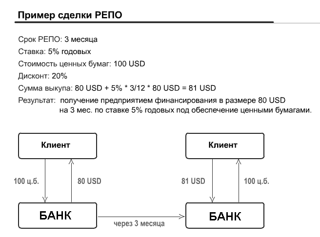 Во-вторых, если у компании скапливаются временно свободные средства на счете, она может эффективно оборачивать их на финансовом рынке, как это делают банки. Вспомнив про банки, нельзя не упомянуть о такой возможности, как получение кредита под залог ценных бумаг, которыми владеет предприятие. Это вполне разумная и принятая во всем мире практика. Кредит может быть предоставлен в форме так называемой сделки РЕПО – обязательства обратного выкупа (схема этой сделки показана на Рис. 11), либо в форме револьверного кредита, который не предусматривает временной продажи (как в случае РЕПО), а подразумевает обременение принадлежащих организации ЦБ путем регистрации залога. В последнем варианте права голоса, права на дивиденды и пр. остаются у собственника-заемщика.