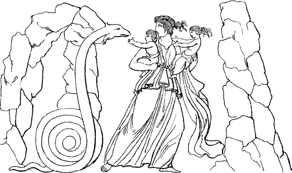 [Закрыть] в руках, с серебряным луком за плечами; золотые стрелы громко звенели в его колчане. Гордый, ликующий, несся Аполлон высоко над землей, грозя всему злому, всему порожденному мраком. Он стремился туда, где жил грозный Пифон, преследовавший его мать Латону; он хотел отомстить ему за все зло, которое тот ей причинил.