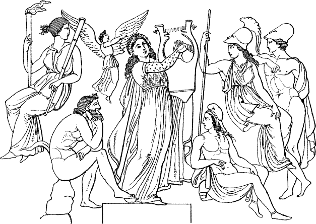 Аполлон и музы. Весной и летом на склонах лесистого Геликона, там, где таинственно журчат священные воды источника Гиппокрены, и на высоком Парнасе, у чистых вод Кастальского родника, Аполлон водит хоровод с девятью музами. Юные, прекрасные музы, дочери Зевса и Мнемосины[27]27